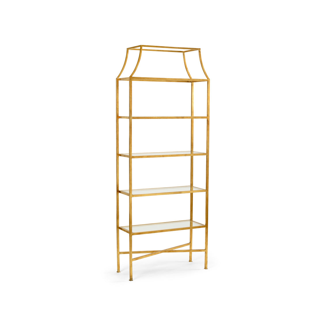 Five clear glass shelves provide ample space for styling decorative objects, barware, books, or collected pieces, allowing light to pass through and keeping the overall look airy and balanced. Whether anchoring a dining room wall or adding vertical interest to a living space, the Gold Leaf Étagère offers a sophisticated way to layer storage and display.