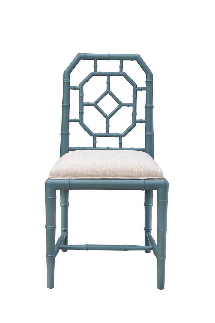 The Winter Park Side Chair brings organic texture and quiet refinement to the table. Its softly finished light blue wood frame is detailed to echo the look of bamboo, lending a relaxed coastal sensibility that feels timeless rather than themed.