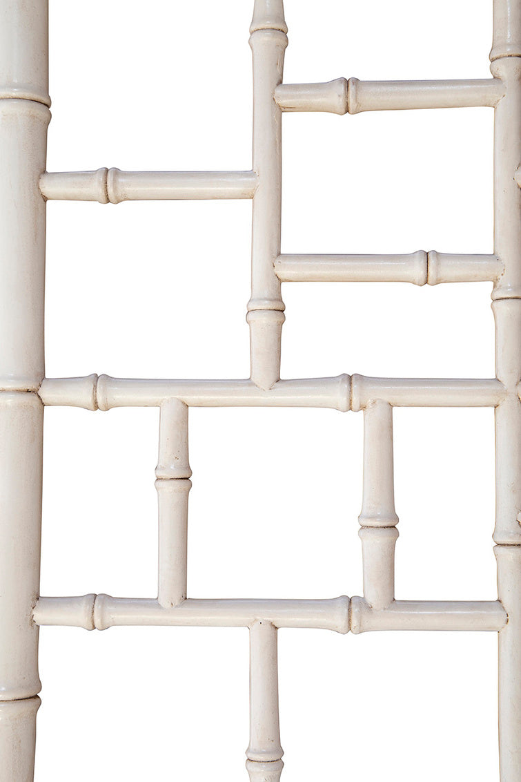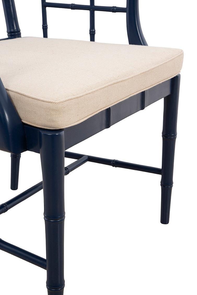 The Wisteria Chair blends classic craftsmanship with a fresh, contemporary sensibility. Hand-shaped from solid mahogany to replicate the look of bamboo, the frame is finished in both vibrant blue and soft cream, bringing color, texture, and architectural interest to today’s interiors.